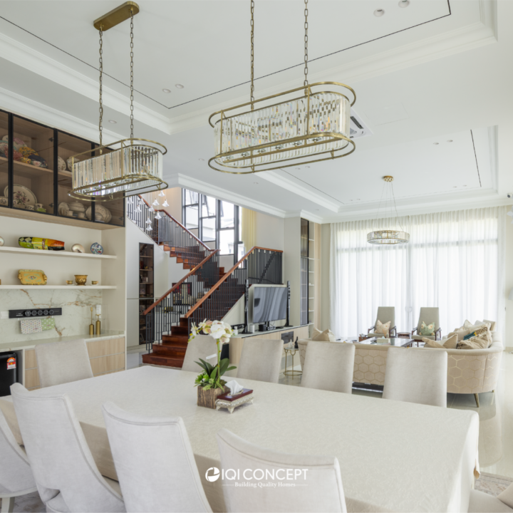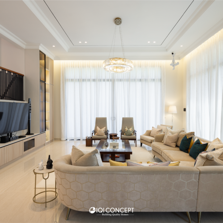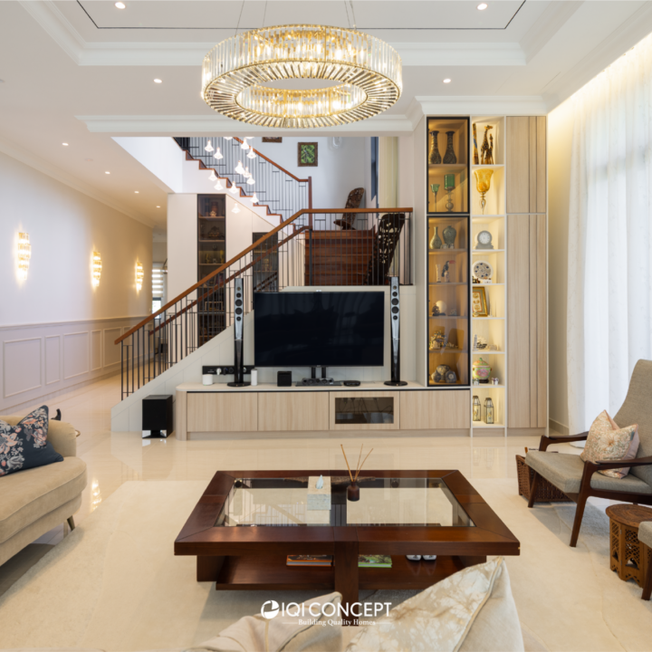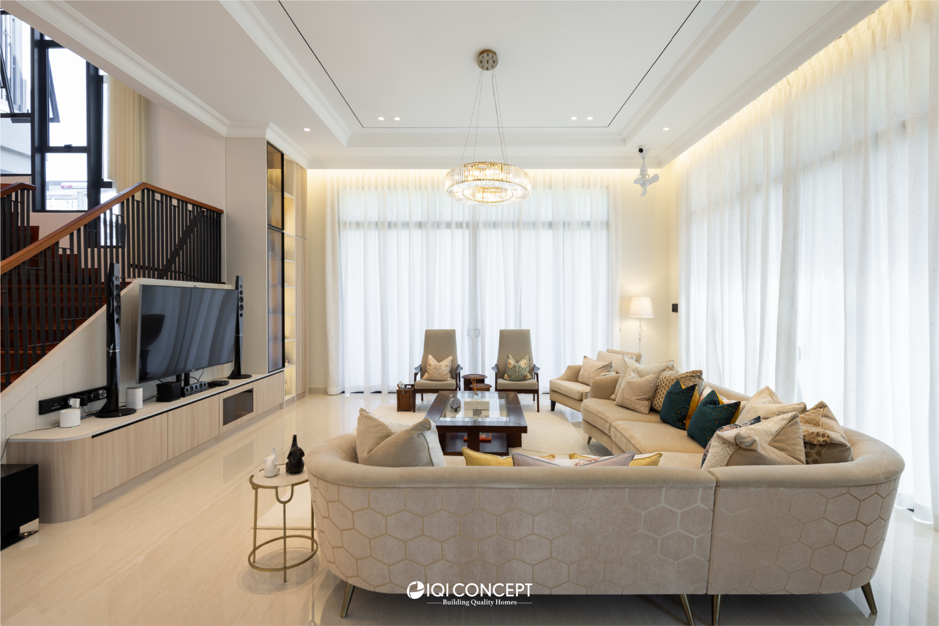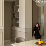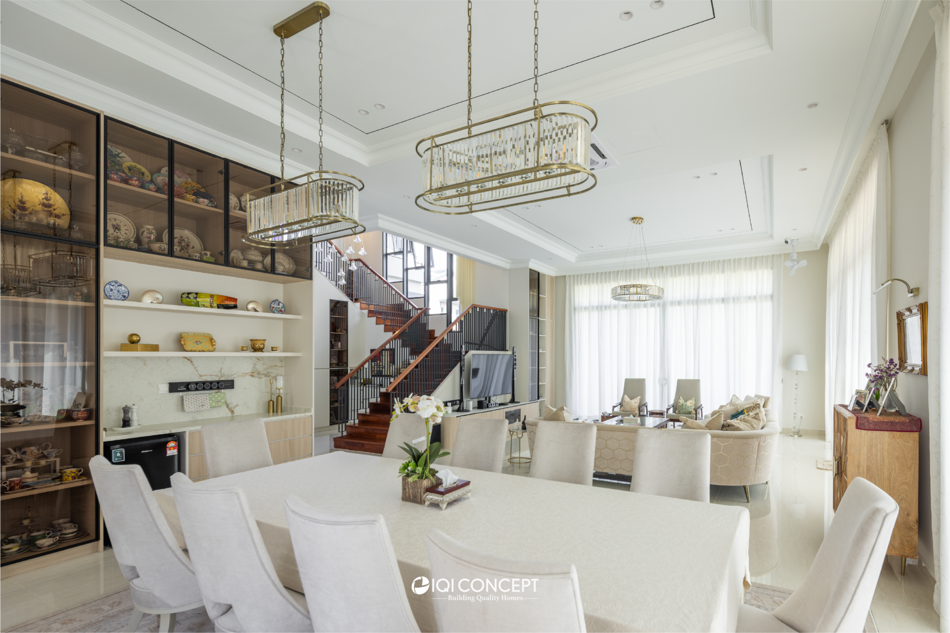 Embracing a Modern Luxe concept, this home features a warm neutral palette that exudes sophistication while maintaining a cozy, lived-in feel. The living and dining area beautifully blends soft neutral tones, crystal chandeliers, and bespoke cabinetry, creating a luxurious yet inviting ambiance.