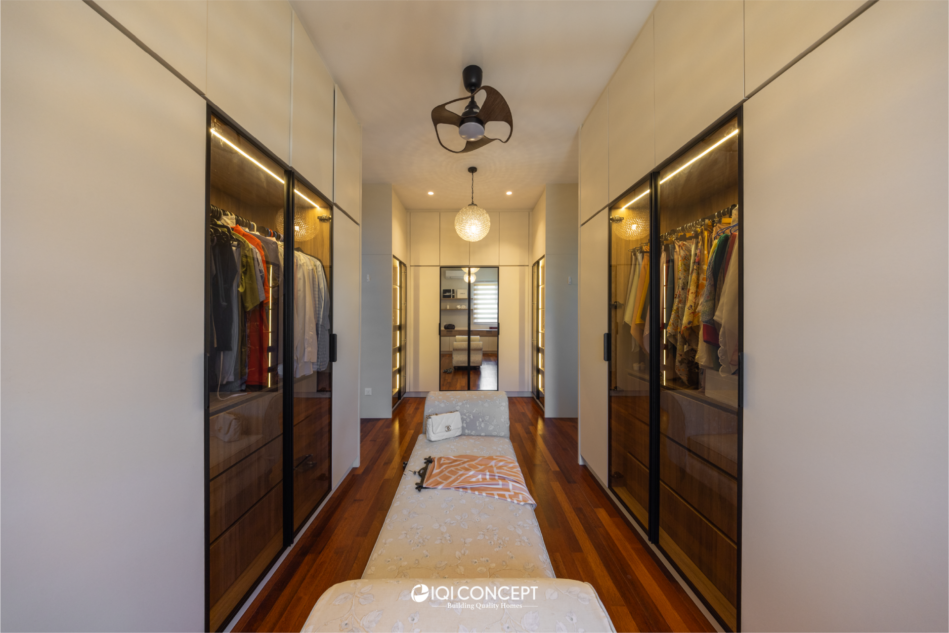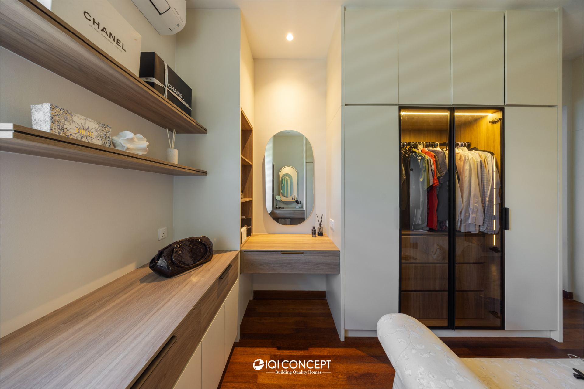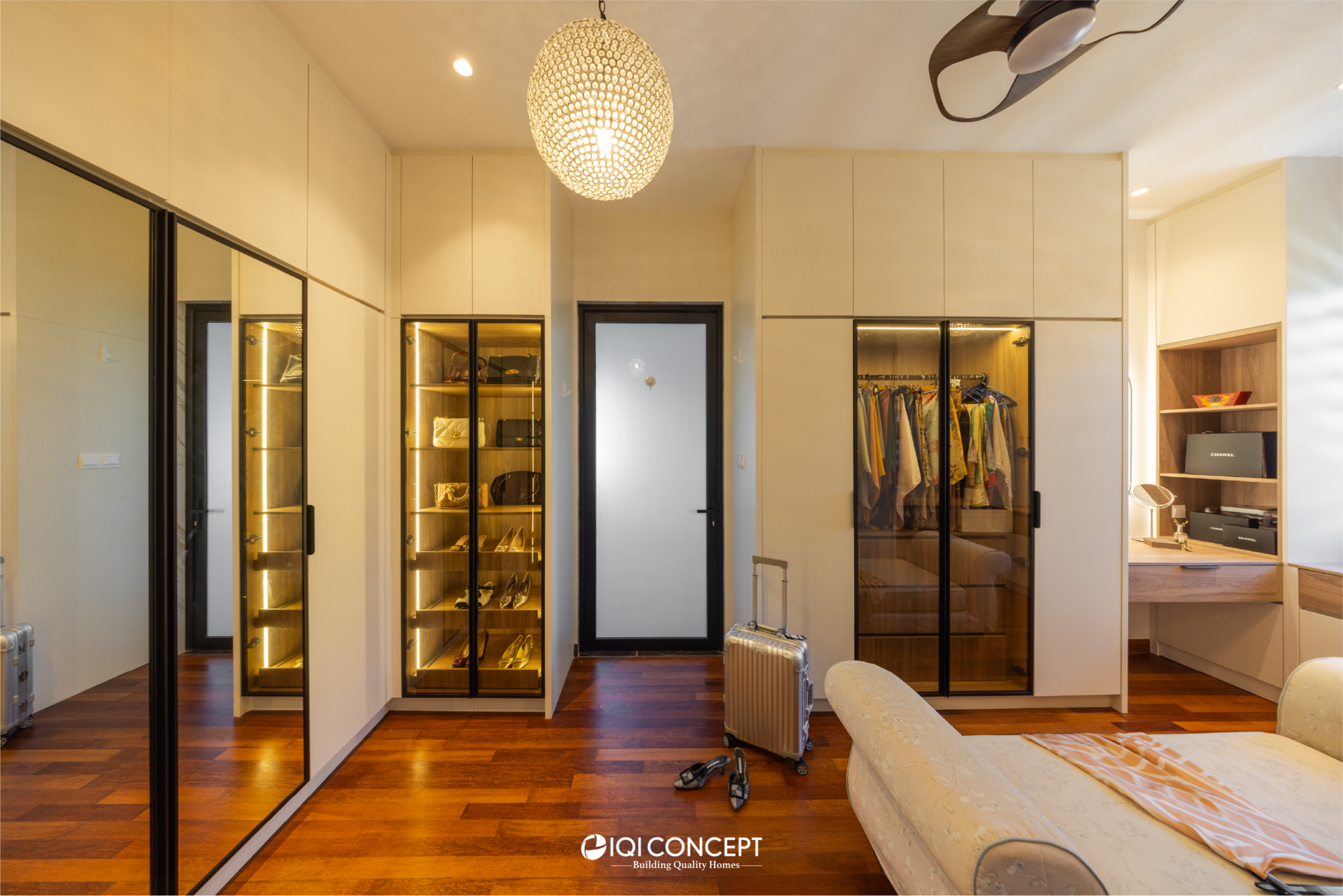 The walk-in wardrobe showcases sleek glass-front cabinets and soft ambient lighting, while the bedroom’s wood accents and gentle neutrals create a calm, sophisticated retreat. Every corner reflects understated luxury, tailored for both style and comfort.