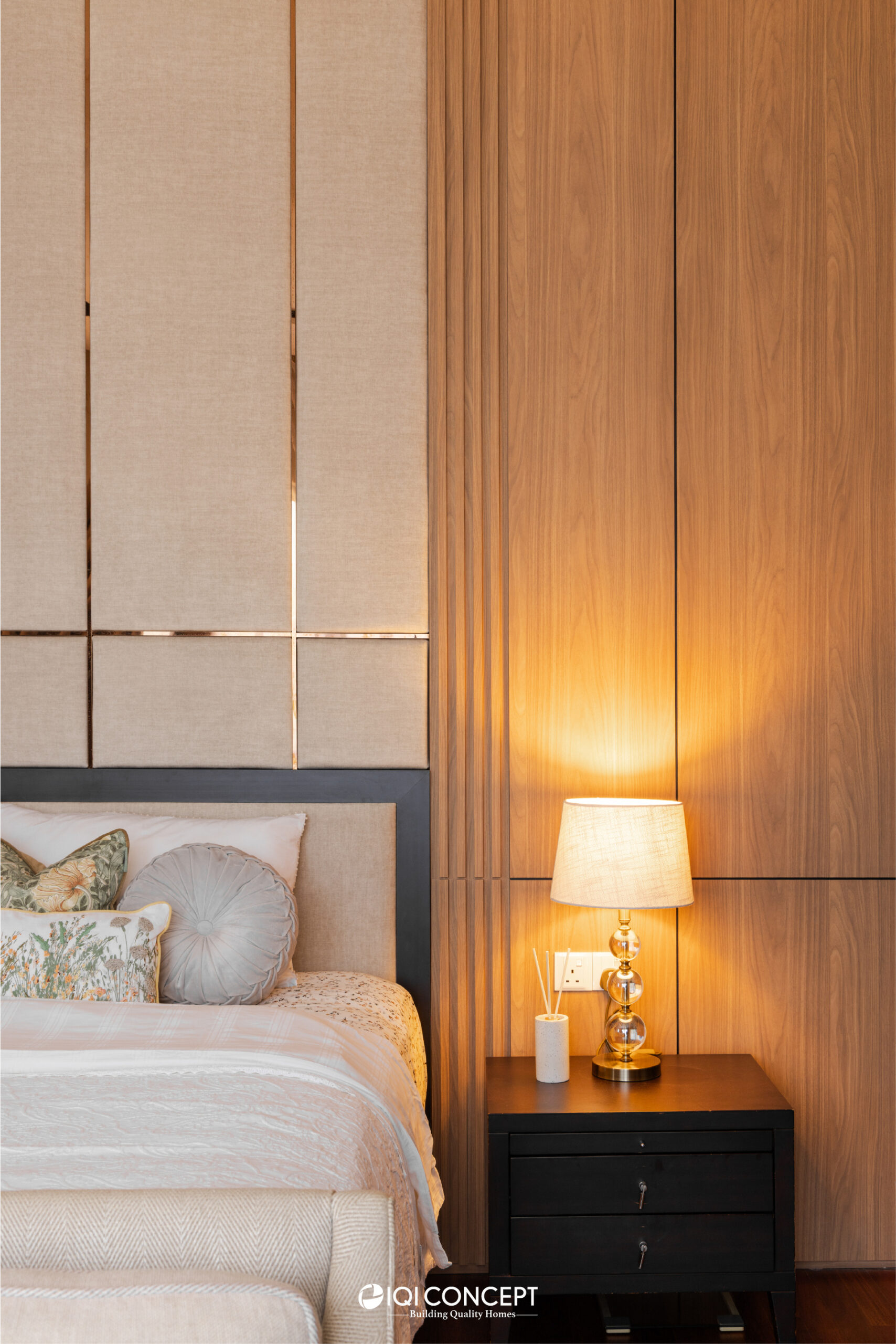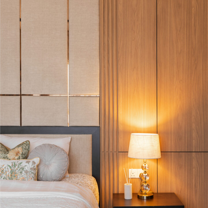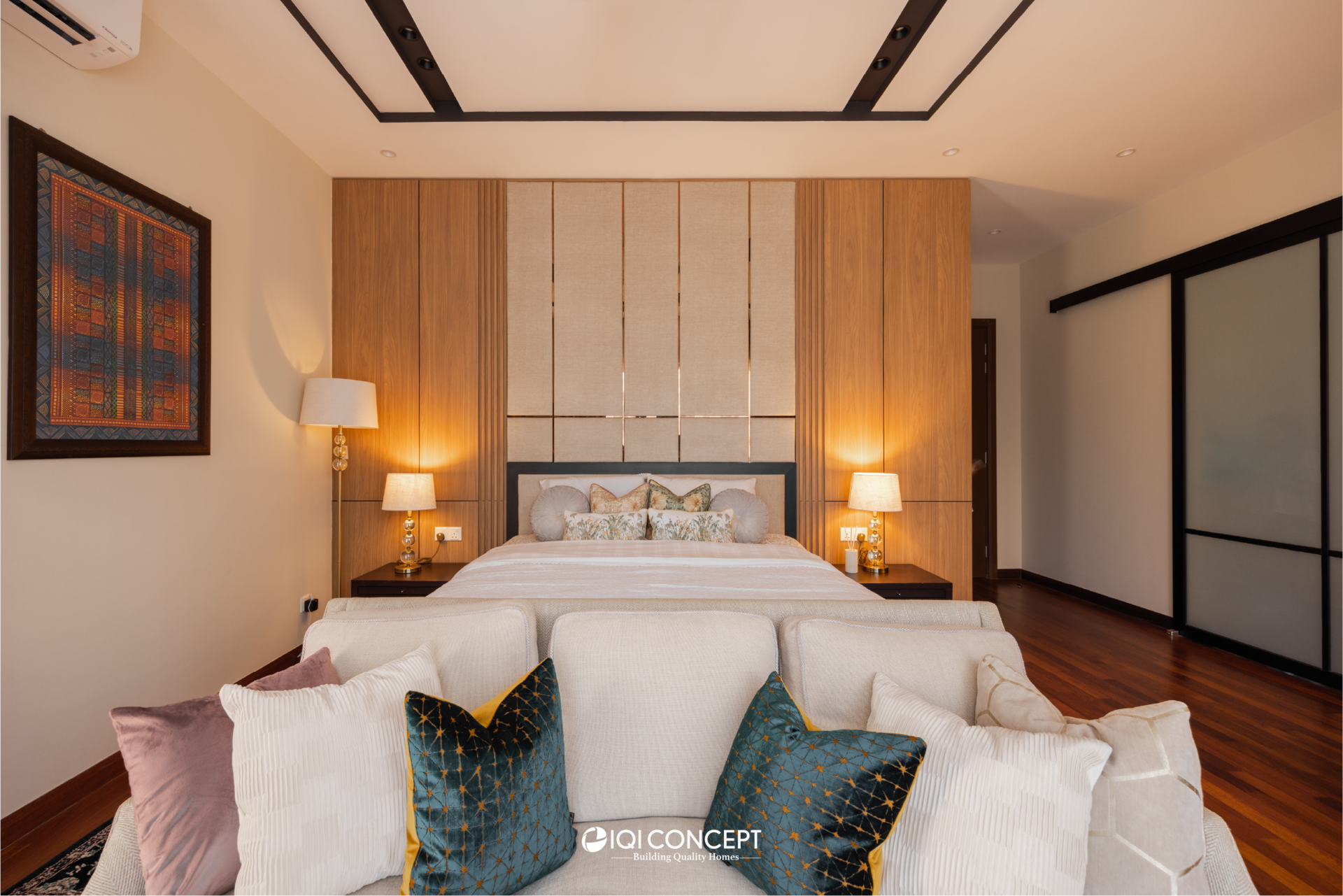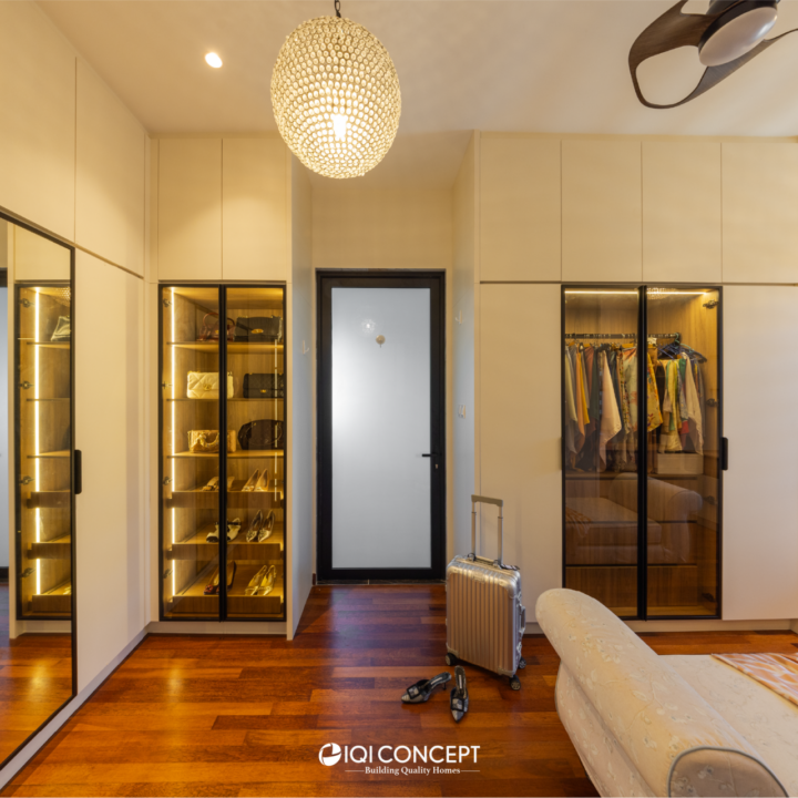 The walk-in wardrobe showcases sleek glass-front cabinets and soft ambient lighting, while the bedroom’s wood accents and gentle neutrals create a calm, sophisticated retreat. Every corner reflects understated luxury, tailored for both style and comfort.